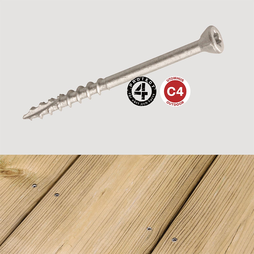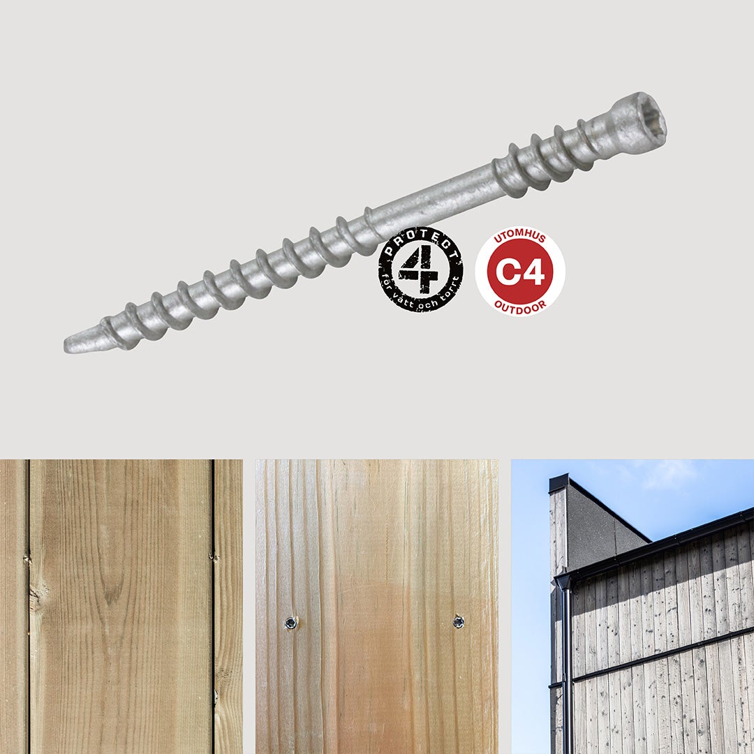 Trallskruv för klassiskt montage av trallvirke eller staket mot träregel. Protect 4-ytbehandling ger bra skydd mot korrosion och gör skruven lämplig för utomhusbruk.