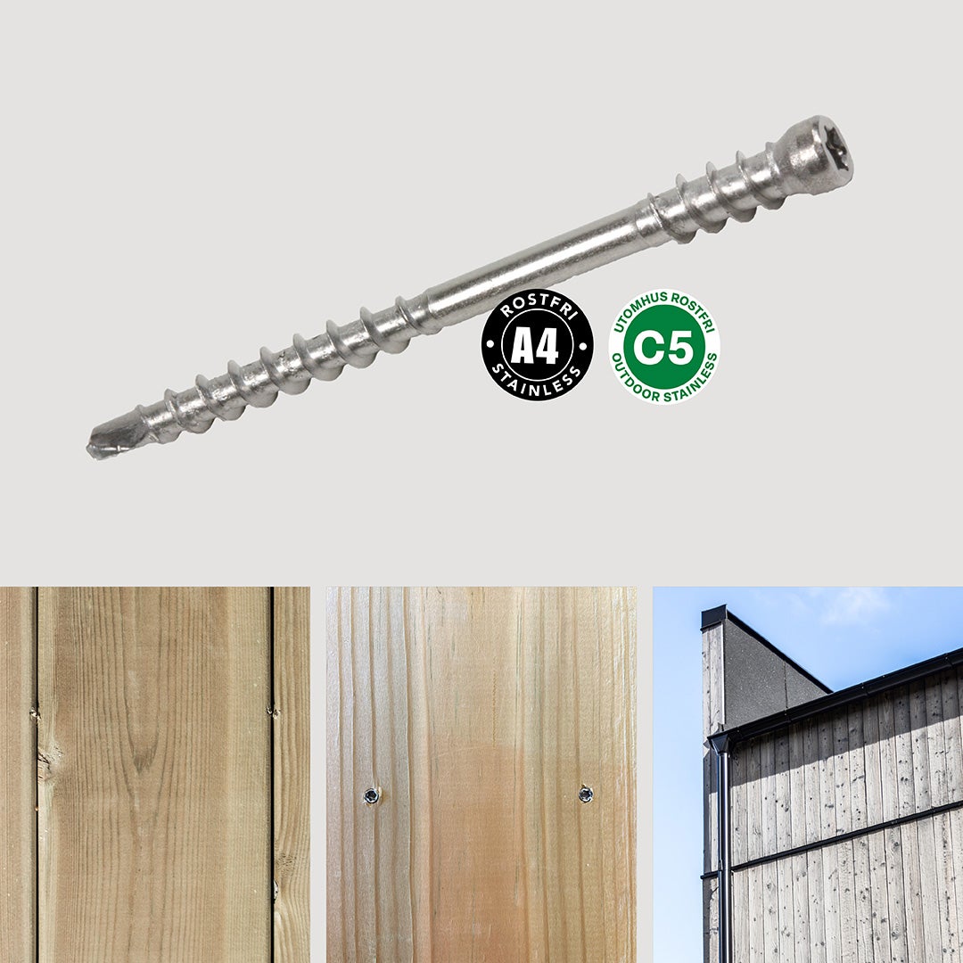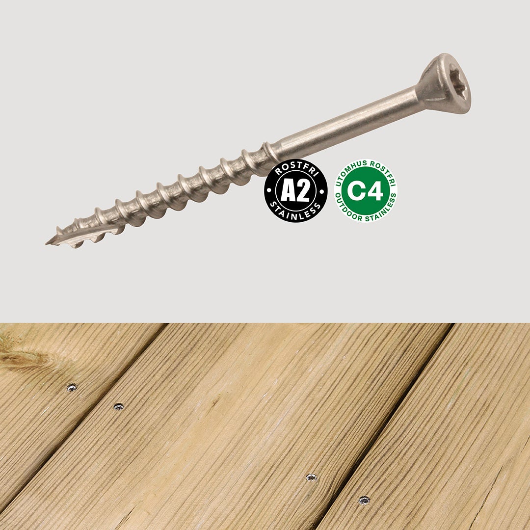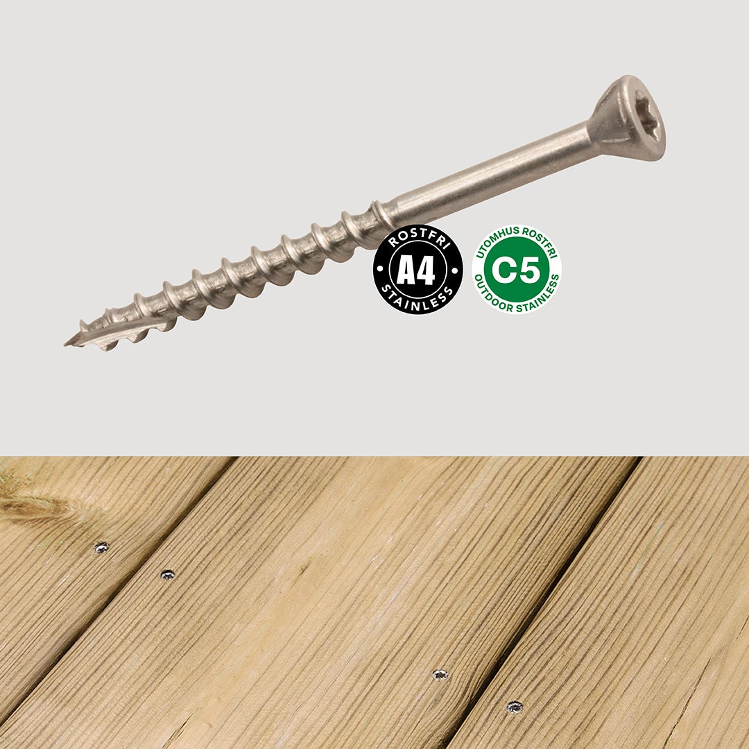 För tralldäck över 20 m2 eller upphöjda byggen rekommenderas rostfria skruvar för bättre hantering av rörelser. I skyddade lägen, som låga tralldäck i milda miljöer, kan ytbehandlade skruvar räcka. Exotiska träslag kräver oftast mer flexibilitet, där är A4-skruv ett bra val.