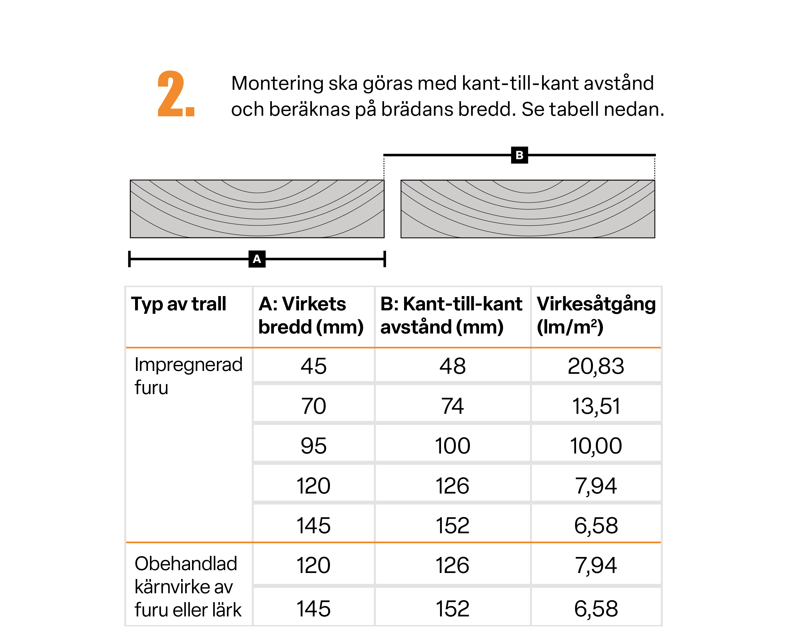 - Om skarvar är oundvikliga i intilliggande trallbrädor, ska dessa förskjutas minst 1 200 mm och fördelas jämnt över hela beläggningen.