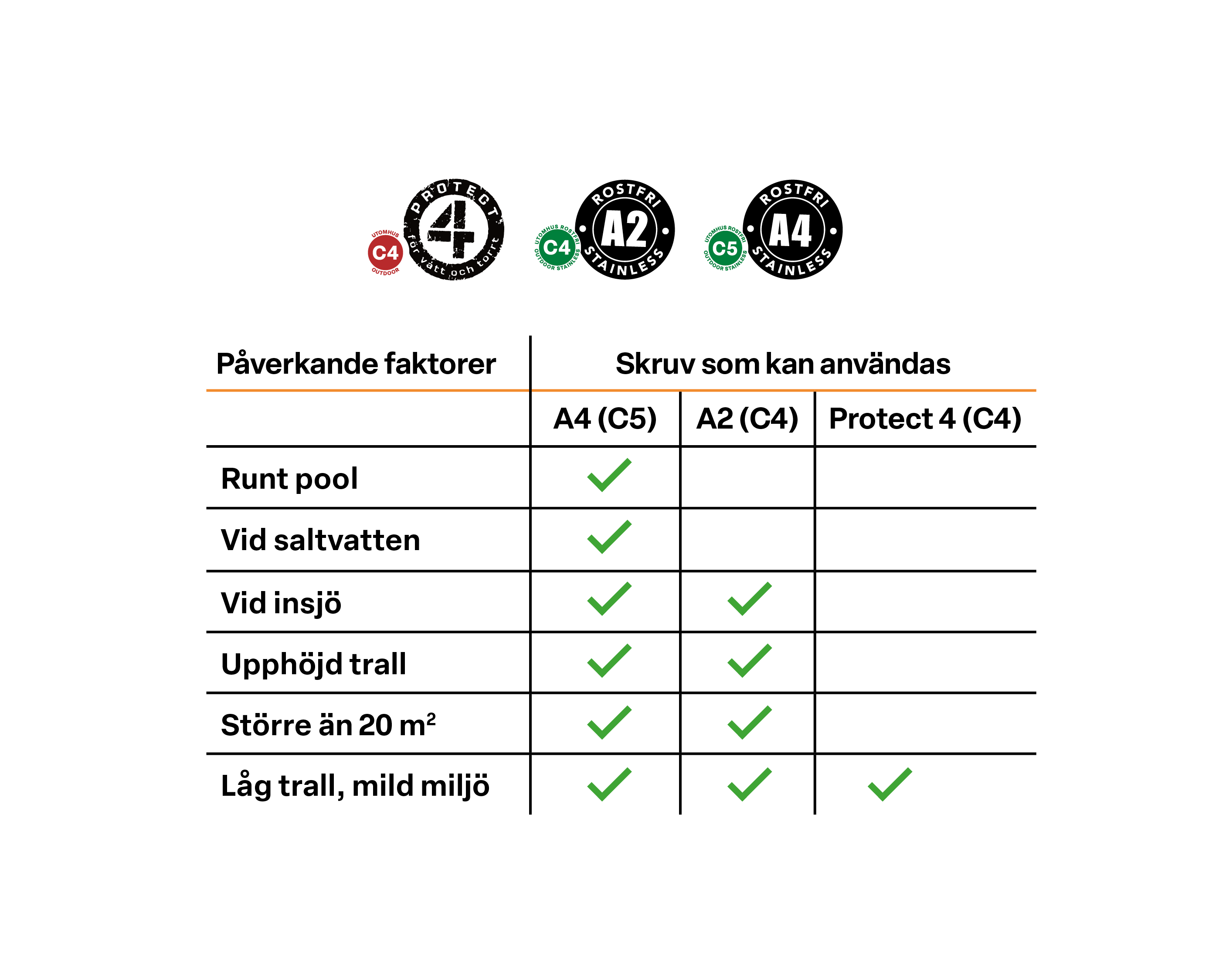 Miljön där trallen byggs spelar en viktig roll i valet av skruv. Korrosivitet, som beskriver hur lätt material rostar, delas in i klasser från C1, för torra inomhusmiljöer, till C5, som är anpassad för kustnära områden och industrimiljöer. Ju högre klass, desto bättre skydd mot rost i krävande förhållanden(se tabell).